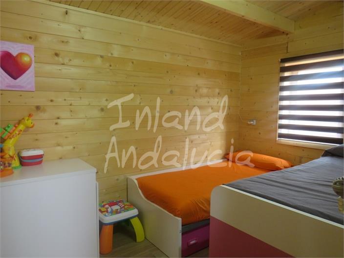 Description: This stunning newly built chalet (luxury cabin) is located on the outskirts of Martos, Jaén province, within a small, secure gated community of approximately 20 properties. Positioned at one of the highest points in the area, the property enjoys lovely panoramic views, stunning sunsets and benefits from a spacious, flat plot of land. The property features a children’s playground and a stunning center piece pool and established fruit trees, including cherry, walnut, fig, apple, peach, pear, orange, and lemon trees, many of which have recently begun producing fruit. Water is supplied via a shared tank/well powered by solar energy and shared with four neighbouring properties. but the property also has its own private backup water tank. Electricity is connected to the main grid.
